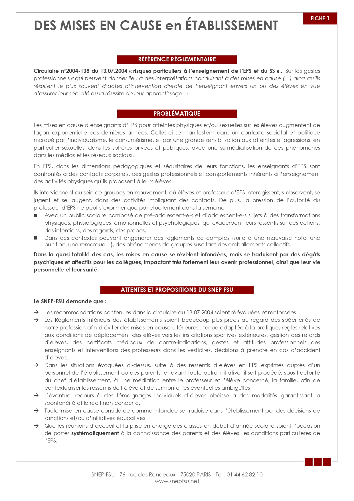 Risques du métier, fiches du SNEP National